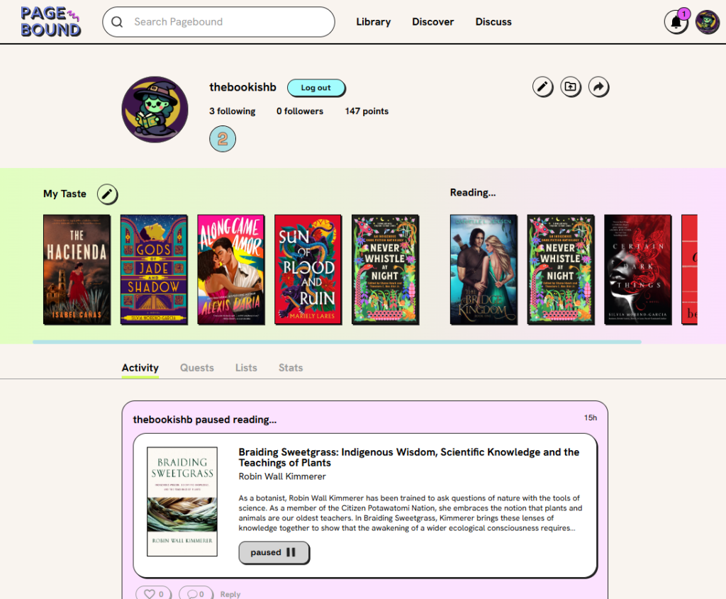 I recently joined PageBound and it’s been so fun to track my books digitally, engage with other users who read the same books, and participate in reading challenges to earn points.